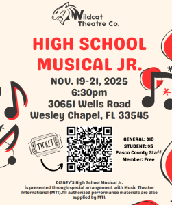 Wildcats! Come see High School Musical Jr. on November 19th-21st, 2025 @ 6:30pm at the Wesley Chapel Center of the Arts. Join our Wildcat Theatre for a show full of singing, dancing, and even basketball!