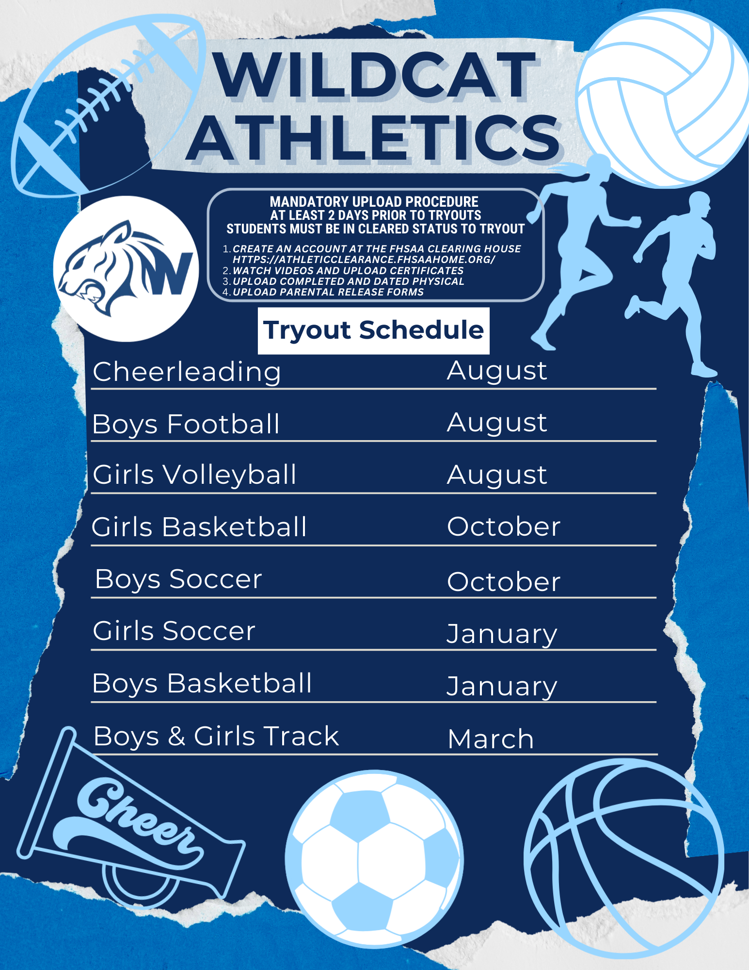 Athletics sports paperwork must now be completed on-line only. It takes 24-48 hours for clearance of the Sports paperwork.